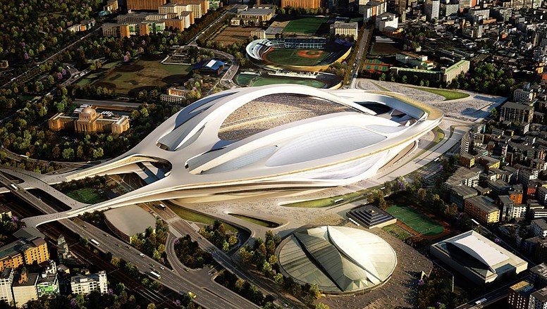 O governo japonês cortou R$ 2,8 bilhões dessa fatia após o ministro do Esporte local afirmar que os gastos seriam exagerados demais. Além disso, a escala do local estava grande demais e o estádio ocuparia muito espaço na parte de fora. A empresa Zaha Hadid Architects, de Londres, refez o próprio visual e disse estar mais preocupada com o urbanismo da região.